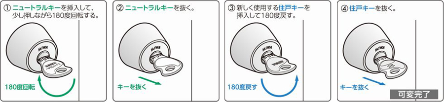 LBシリンダーの錠前の交換は、ニュートラルキーを挿入して次に使用したいカギを挿入するだけです。ドアを開けなくても交換ができます。 工具は必要ありません。