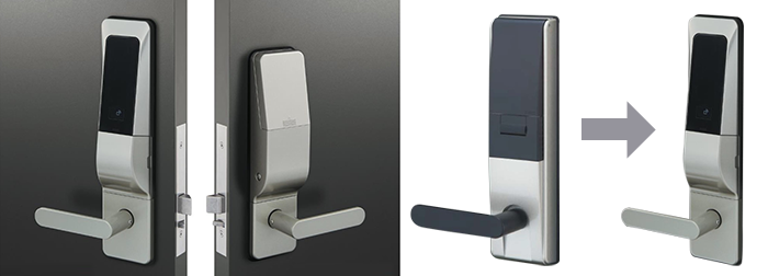 室外側ハンドルは施錠時固定式で、カードまたはテンキーでID認証をすることで、ハンドル操作が可能になり解錠します。室内側からは、常時ハンドル操作のみで解錠できるアンチパニック仕様となっています。
